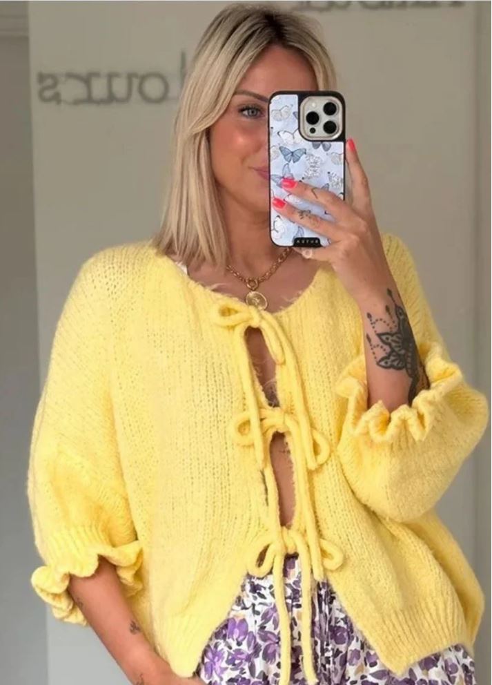 Dit charmante vest met korte mouwen en speelse striksluitingen is een luchtige en stijlvolle toevoeging aan je garderobe. De zachte stof en de subtiele ruches aan de mouwen geven het een vrouwelijke en verfijnde uitstraling.