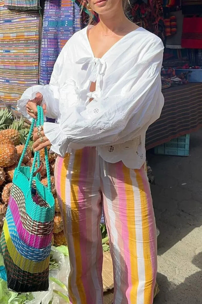 Deze blouse is ideaal voor verschillende uitstraling. Combineer hem met een vrolijk gekleurde broek voor een speelse en zomerse uitstraling. Voeg een geweven tas en sandalen toe voor een relaxte uitstraling tijdens een dagje uit. Voor een elegantere kleding kun je de blouse combineren met een lange rok en hakken, wat perfect is voor een avondje uit of een zomerse brunch.