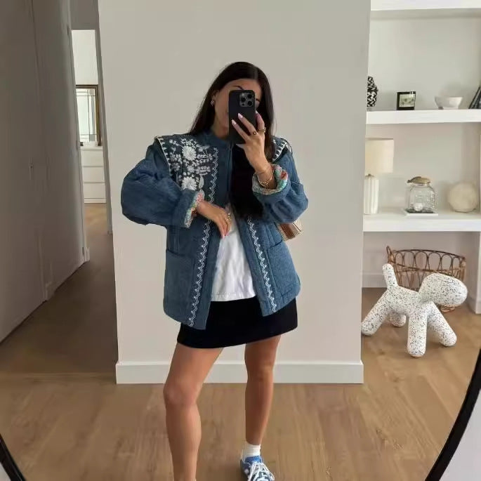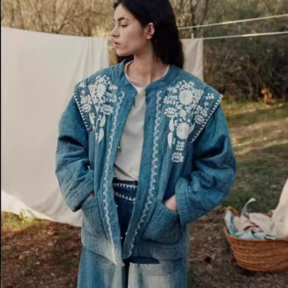 Dit charmante gewatteerde jack brengt handwerk en elegantie perfect samen. Het rechte, iets boxy silhouet zorgt voor een tijdloze uitstraling, terwijl de zachte vulling warmte en comfort biedt op koelere dagen. De echte blikvanger is de sierlijke borduurkunst: delicate bloemenmotieven sieren de schouders en voorkant en geven het jack een rustieke, ambachtelijke flair.