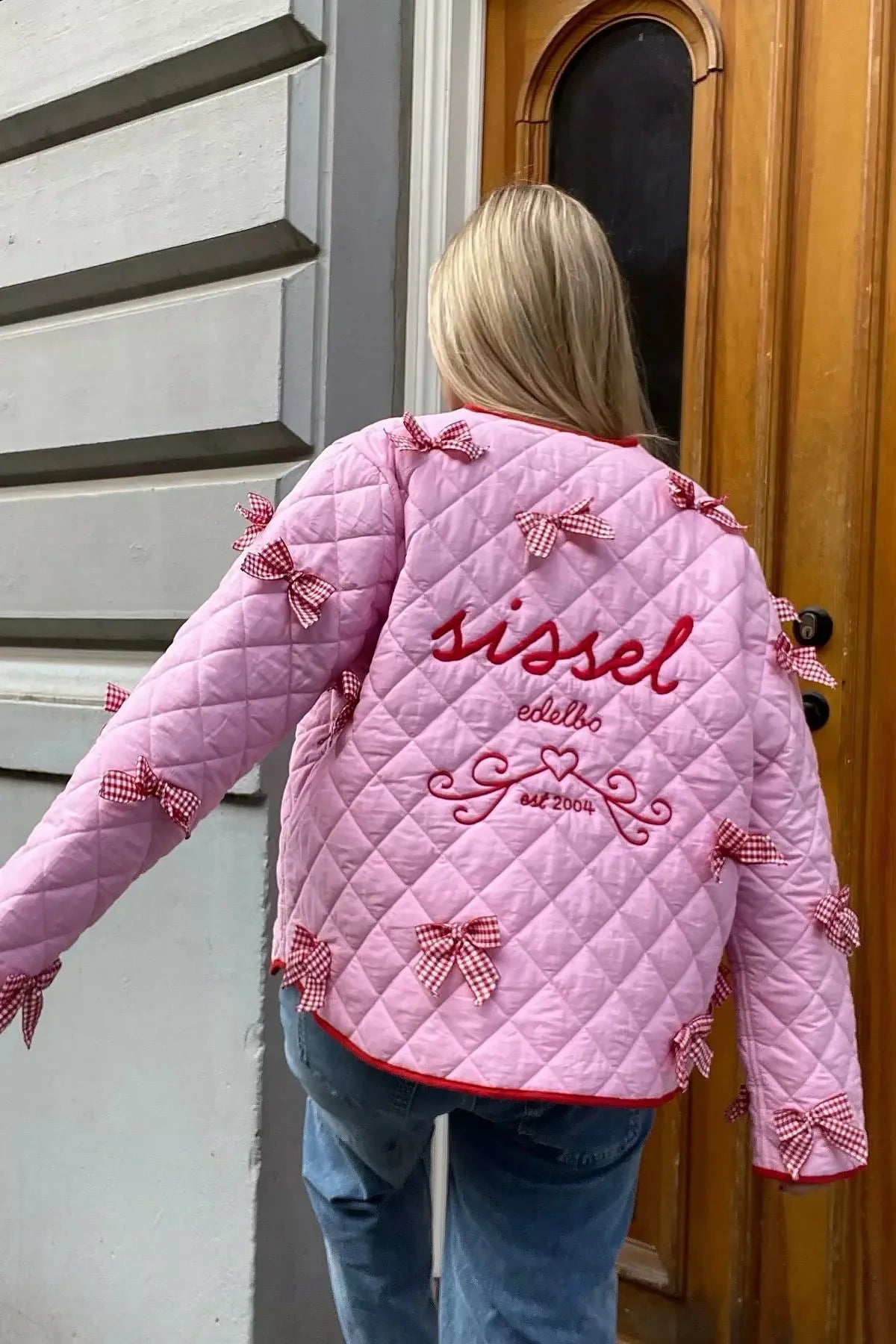Dit charmante gewatteerde jack combineert speelse details met een comfortabele pasvorm. De striksluiting aan de voorkant en de sierlijke strikjes geven een romantische uitstraling, terwijl de doorgestikte stof zorgt voor extra warmte. De contrasterende afwerking voegt een opvallend tintje toe aan dit unieke ontwerp.
