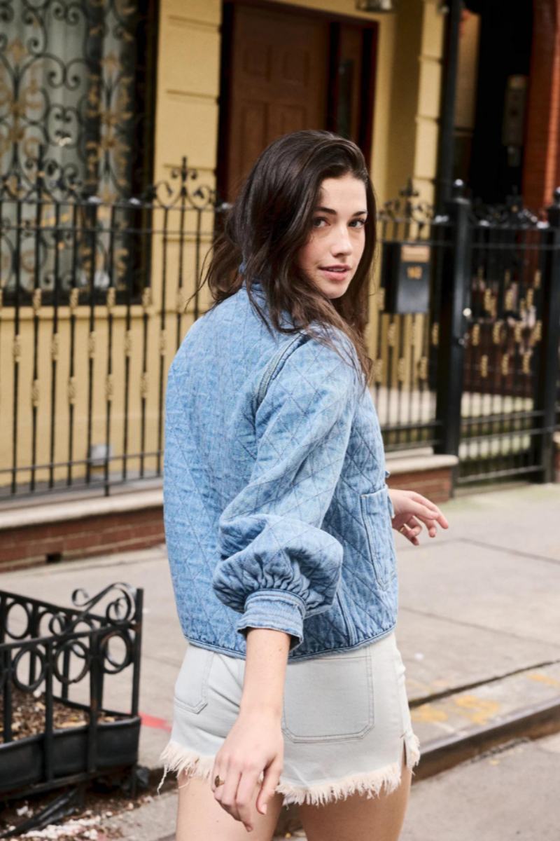 Dit charmante gewatteerde jasje combineert stijl en comfort. De speelse ruches langs de kraag en de striksluiting geven het een vrouwelijke uitstraling, terwijl de gewatteerde stof zorgt voor warmte.