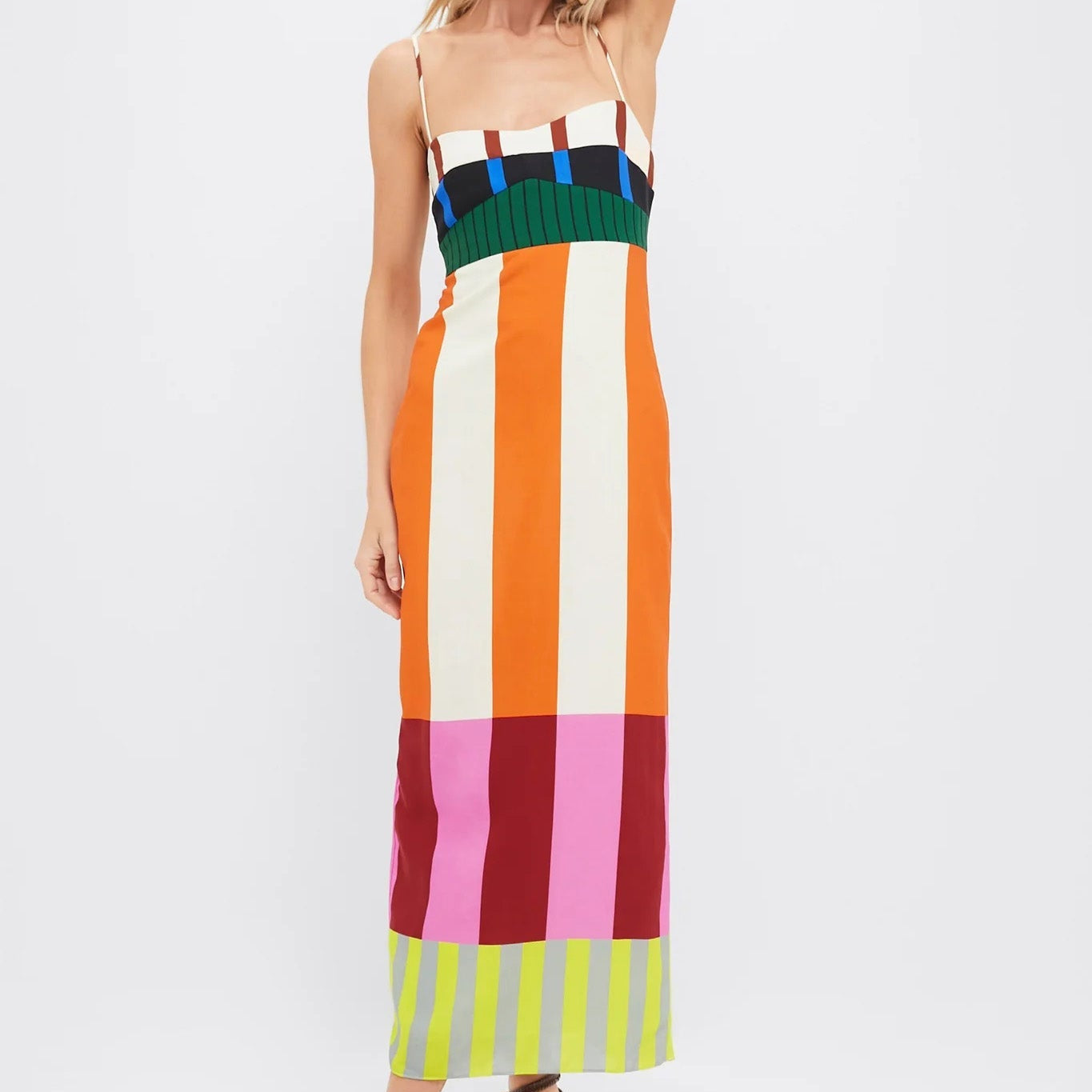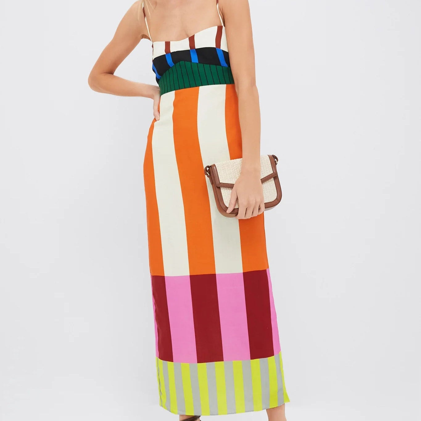 Dit opvallende jurkje met spaghettibandjes en een streeppatroon in kleurblokken is een ware blikvanger. De jurk valt tot halverwege de kuit en is uitgevoerd in een slank silhouet dat de natuurlijke lichaamsvorm mooi accentueert. De spaghettibandjes geven het geheel een delicate uitstraling, terwijl het nauwsluitende lijfje zorgt voor een subtiel flatterende pasvorm.