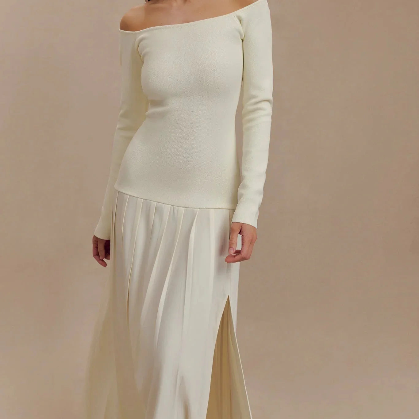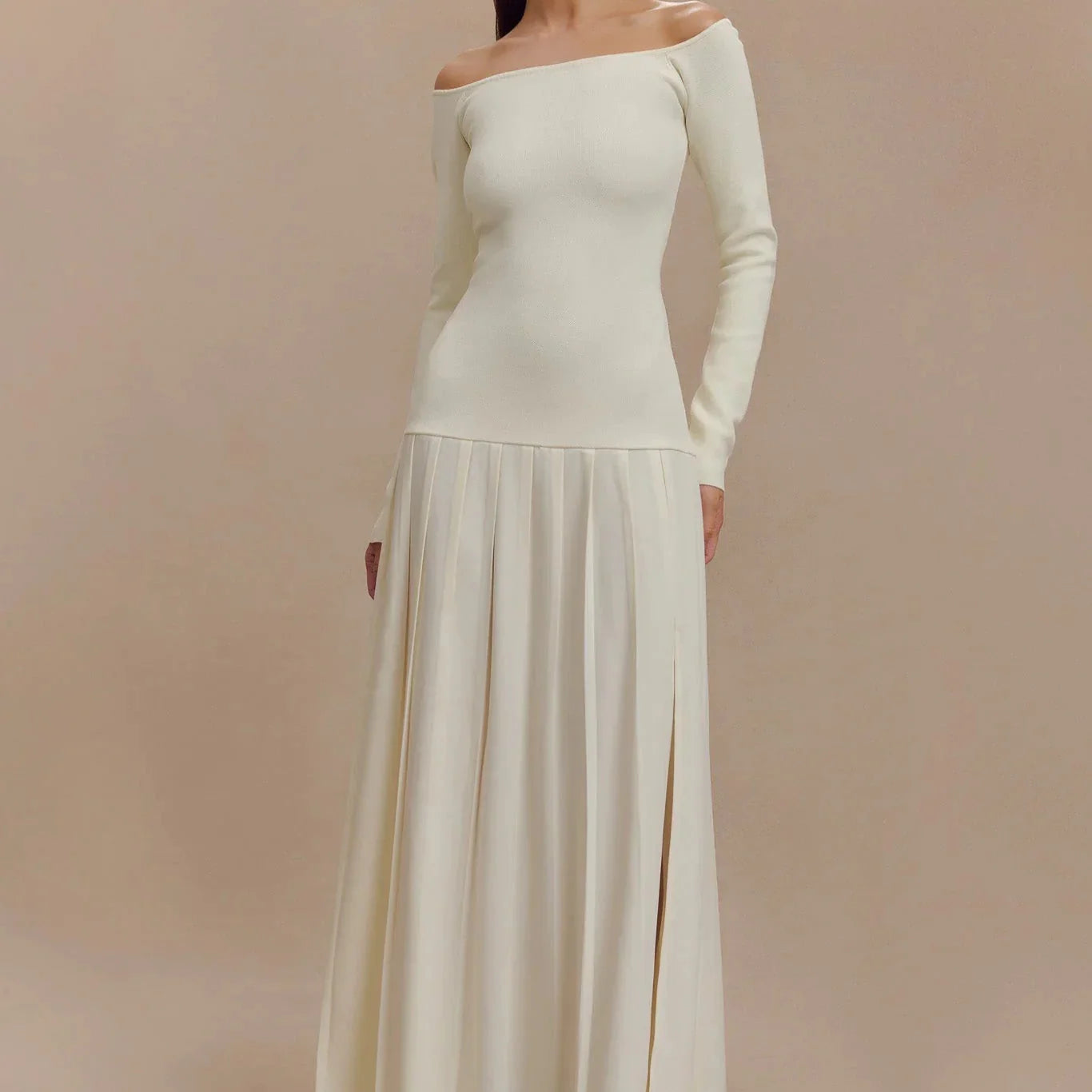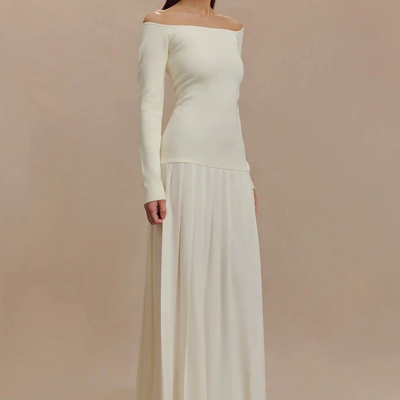 Deze maxi jurk ademt pure elegantie en tijdloze schoonheid. De nauwsluitende bovenkant benadrukt op subtiele wijze het vrouwelijke silhouet, terwijl de off-schouderlijn een verfijnde en romantische uitstraling geeft. De lange mouwen zorgen voor een sierlijke balans tussen ingetogen klasse en moderne verfijning, waardoor de jurk perfect is voor uiteenlopende gelegenheden.