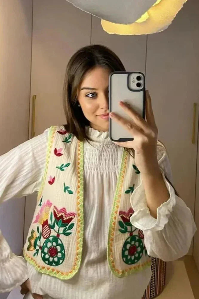 Dit charmante open gilet voegt een vleugje bohemian elegantie toe aan elke kleding. Met prachtige bloemenborduursels en levendige gegevens is dit lichte kledingstuk perfecte om mee te layeren. De delicate stiksels langs de randen versterken het ambachtelijke ontwerp, wat zorgt voor een unieke uitstraling.