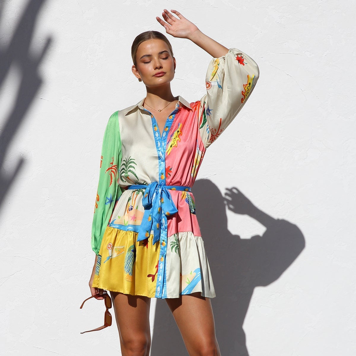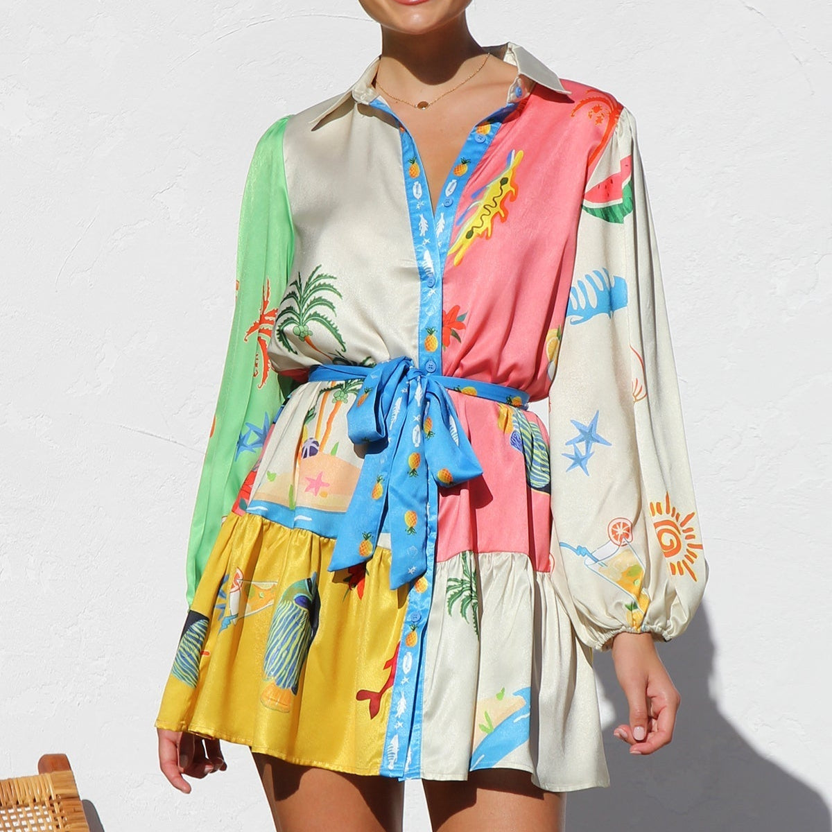Deze overhemdjurk met tropische print en strikceintuur is een levendige viering van zomer, kleur en speelsheid. Het ontwerp combineert een klassiek hemdmodel met een creatieve twist: de jurk is opgebouwd uit panelen in diverse tropische kleuren zoals fuchsia, blauw, geel, crème en groen, die versierd zijn met illustratieve motieven van fruit, planten, zeedieren en zonnige landschappen. Het resultaat is een expressieve en vrolijke uitstraling die meteen doet denken aan vakantie aan zee.