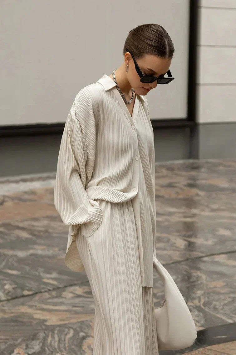 Dit plissé loungepak met overhemdkraag biedt de perfecte combinatie van comfortabele en stijl voor wie houdt van een minimalistische en elegante uitstraling. Het pak bestaat uit een losvallende blouse met klassieke overhemdkraag en knoopsluiting, en een bijpassende rechte broek met een comfortabele tailleband. De fijne plisséstructuur zorgt niet alleen voor een luchtig gevoel, maar geeft ook een subtiele textuur die het geheel een verfijnde uitstraling geeft. Dankzij de soepele stof valt het pak prachtig om het lichaam en beweegt het moeiteloos mee met elke stap.